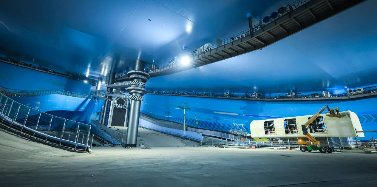 盡管室內(nèi)滑雪場仍在施工中,但嶄新的雪具大廳已經(jīng)進入裝修的最后階段,分布在墻上和頂棚的藍色光帶營造的雪花造型,給人以強烈的視覺沖擊。進入到滑雪場內(nèi)部,四條不同等級的雪道顯露真容,拖掛式纜車的核心設(shè)備已安裝到位,空中纜線基本鋪設(shè)完成。