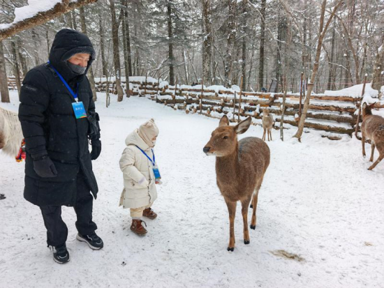 行至景區(qū)中心處的“粉雪部落”,濃郁的東北風情撲面而來。“智取威虎山”主題場景成了最熱鬧的打卡點,歡聲笑語不斷。鹿園里,孩子們輕輕撫摸馴鹿、喂食苔蘚,體驗著與森林精靈親近的樂趣!霸谀戏綇臎]見過真正的馴鹿,這種體驗太難得了”,來自云南的段先生一邊錄制視頻,一邊準備向家人“炫耀”這份難得的美好。