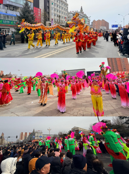 20支秧歌隊伍從大劇院出發(fā),沿南湖大街至敖東大街與長白路交匯處行進展演,傳統(tǒng)東北大秧歌、滿族秧歌輪番登場,踩高蹺、舞龍舞獅……各類非遺絕活悉數(shù)展現(xiàn)。樂隊嗩吶與鑼鼓镲交織出快慢錯落的傳統(tǒng)曲牌,演員們將秧歌的精髓演繹得淋漓盡致,成為街頭流動的風(fēng)景線,隊伍一路載歌載舞,所到之處歡呼不斷,喜慶氛圍遍布敦城街巷,生動展現(xiàn)“吉祥敦化”的和諧盛景。
