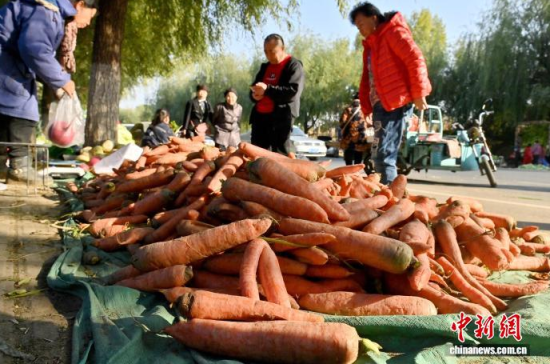 10月16日,吉林長春,市民在挑選胡蘿卜。當下正是中國東北民眾“囤秋菜”的季節(jié),滿載大蔥、白菜、胡蘿卜等秋菜的貨車?吭陂L春市區(qū)指定銷售區(qū)域,市民們穿梭挑選,忙碌地儲備過冬秋菜。中新社記者 張瑤 攝