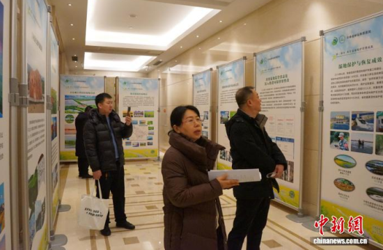 2月2日,參會(huì)人員在參觀吉林省濕地保護(hù)宣傳板。 單碩 攝