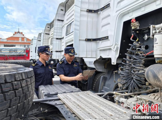 海關(guān)關(guān)員在關(guān)累港口岸對(duì)出口重卡牽引車(chē)開(kāi)展查驗(yàn)。 康明 攝