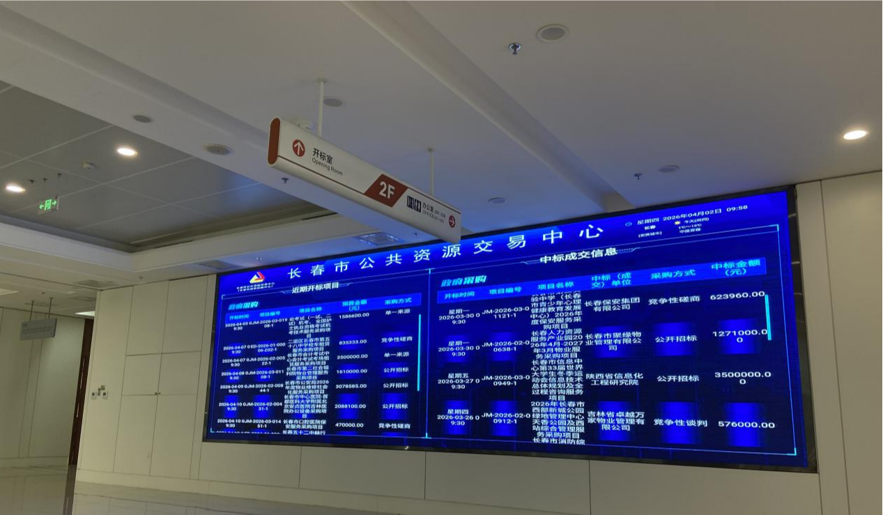 在長春市政務(wù)服務(wù)中心二樓,記者看到,這里設(shè)有開標(biāo)室、澄清室等多個功能區(qū)域,LED屏幕實時滾動著政府采購近期開標(biāo)項目和中標(biāo)成交信息,方便企業(yè)人員隨時查看、跟蹤項目進(jìn)展。