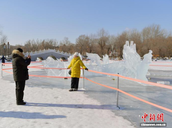 1月20日,在長春市南湖公園,“龍鳳呈祥”冰雕吸引市民駐足觀看 。該冰雕主體為一條長達45米的冰龍與一只展翅約20米的冰鳳凰組成,兩者遙相呼應(yīng),蜿蜒盤旋在冰面上。冰雕充分利用了北方冬季的自然條件,在陽光下晶瑩剔透,成為公園內(nèi)一道醒目的冬日景觀。中新社記者 張瑤 攝