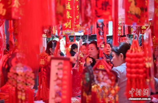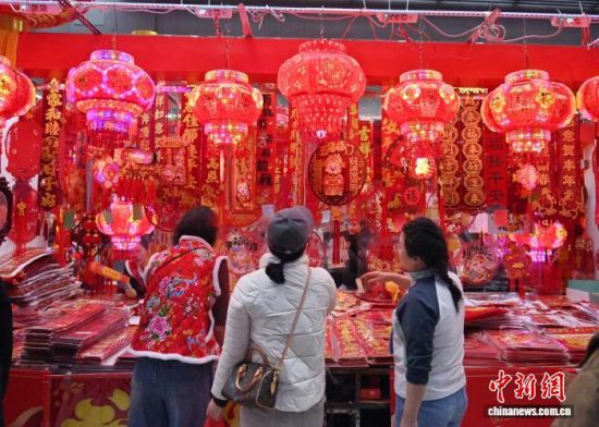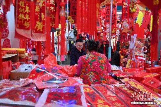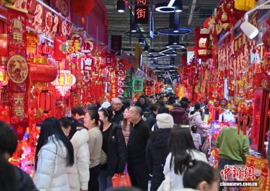 2月12日,長(zhǎng)春一家商場(chǎng)的年貨區(qū)年味十足。隨著農(nóng)歷馬年春節(jié)的臨近,各類(lèi)生肖飾品、年節(jié)掛飾銷(xiāo)售持續(xù)升溫,琳瑯滿(mǎn)目的新春飾品吸引民眾駐足挑選。中新社記者 張瑤 攝
