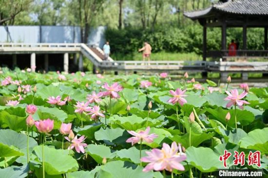 2024年7月9日,在長春北湖國家濕地公園內(nèi),綻放的荷花與翠綠的荷葉相映如畫。(資料圖) 張瑤 攝