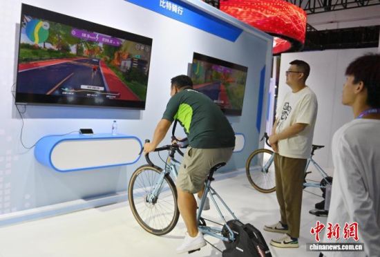 2023年8月24日,吉林長春,市民體驗比特騎行,感受數(shù)智競技運(yùn)動的樂趣。第十四屆中國—東北亞博覽會首次設(shè)置現(xiàn)代裝備與新能源合作主題館,集中展示人工智能平臺、新能源智能轎跑、制氫整流電源等裝備和產(chǎn)品。 (資料